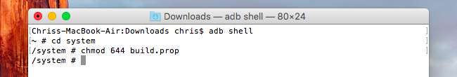 Successivamente, digita i seguenti comandi per aprire una shell sul dispositivo tramite adb ed eseguire i comandi sul tuo dispositivo Android stesso. Questo cambia le autorizzazioni del file build.prop in quelle corrette: