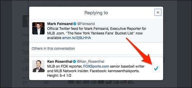 Sotto il tweet, vedrai un elenco di utenti menzionati nel tweet. Per escluderli dalla tua risposta, fai semplicemente clic sulla casella di controllo accanto all'utente per deselezionarla.