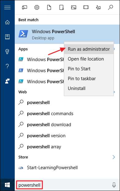 Per eseguire questi passaggi, dovrai avviare PowerShell con privilegi di amministratore. Fare clic su Start, digitare "powershell", fare clic con il pulsante destro del mouse sull'icona di PowerShell nei risultati della ricerca, quindi fare clic su "Esegui come amministratore". Fare clic su Sì per consentirgli i privilegi di amministratore.