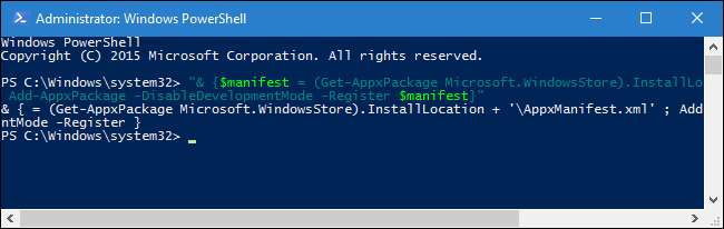 "& {$manifest = (Get-AppxPackage Microsoft.WindowsStore).InstallLocation + '\AppxManifest.xml' ; Add-AppxPackage -DisableDevelopmentMode -Register $manifest}"