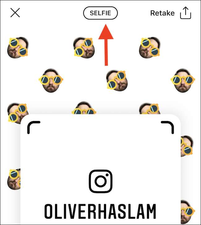 Con il tuo Nametag visibile, puoi selezionare uno dei tre diversi tipi di tag: Selfie, Emoji o Color. Tocca il pulsante nella parte superiore dello schermo per scorrerli.