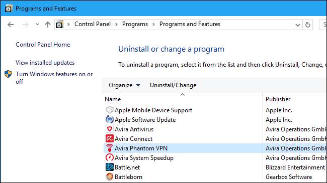 Per impedire in modo permanente a questi strumenti di visualizzare le notifiche e impedire loro di molestarti per denaro, ti consigliamo di andare su Pannello di controllo> Disinstalla un programma e disinstallare entrambi gli strumenti "Avira Phantom VPN" e "Avira System Speedup".