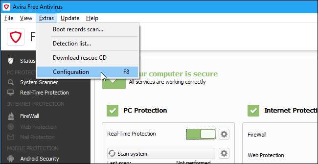 Nella finestra Avira Antivirus, fare clic su Extra> Configurazione.