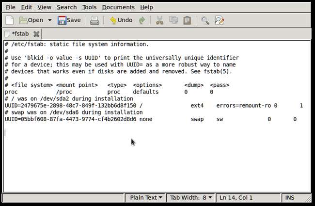 Potresti vedere un tema più brutto del solito su gedit, ma non preoccuparti. Aggiungi le seguenti righe in fondo a fstab, sostituendo il tuo UUID invece del mio:
