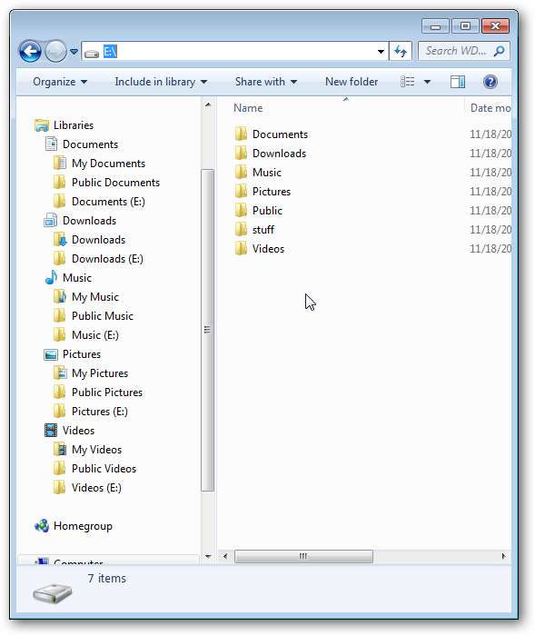 Come puoi vedere, le cartelle delle mie unità di archiviazione fanno parte delle mie librerie. La mia lettera di unità di archiviazione è E: perché la mia condivisione di rete è in D :. Inoltre, dai un'occhiata al nostro " Modifica la cartella di salvataggio predefinita per le librerie di Windows 7 ... "In modo che quando inserisci elementi nelle tue librerie, vengono automaticamente salvati anche nelle nuove cartelle di archiviazione.