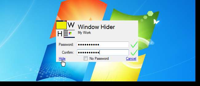 Viene visualizzata la finestra di dialogo Window Hider. Per impostazione predefinita, viene richiesta una password per proteggere la finestra. Se non desideri applicare una password alla finestra, fai clic sulla casella di controllo Nessuna password. Altrimenti, inserisci una password per proteggere la finestra e fai clic su Nascondi.