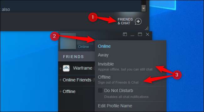 Per farlo, fai clic sull'opzione "Amici e chat" in Steam, fai clic sul tuo nome utente e seleziona "Offline" o "Invisibile". I tuoi amici non saranno in grado di vedere a cosa stai giocando in questo momento, anche se queste informazioni verranno comunque visualizzate nella pagina del tuo profilo.