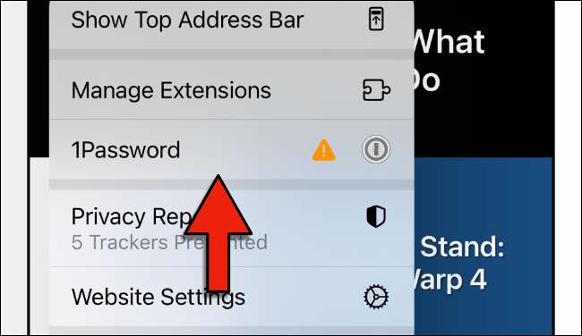 Nel caso di 1Password, ad esempio, se si tocca la sua voce di menu, l'app ti chiederà per la tua password master, quindi mostra gli accessi disponibili per il sito Web che stai esplorando.