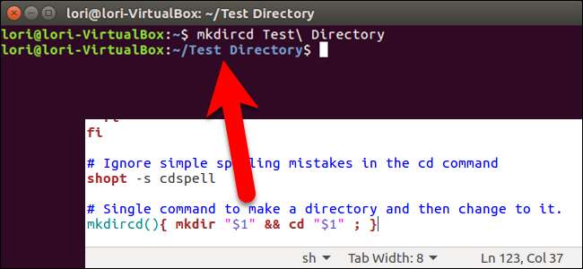 viene chiamata la funzione creata nel file .bashrc e il nome della directory "Test \ Directory" viene passato ai due comandi (