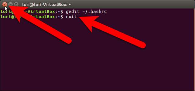 L'impostazione appena aggiunta al file .bashrc non influirà sulla sessione corrente della finestra di Terminale. È necessario chiudere la finestra Terminale, disconnettersi e rientrare affinché la modifica abbia effetto. Quindi, digita exit al prompt e premi Invio o fai clic sul pulsante "X" nell'angolo in alto a sinistra della finestra. Quindi, disconnettiti e accedi nuovamente.