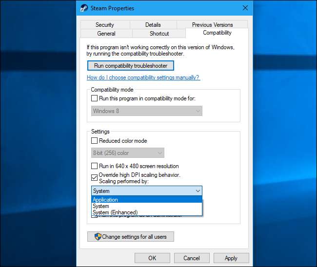 Dovrai anche scegliere una delle tre opzioni di ridimensionamento DPI elevato dal menu a discesa. Ecco cosa fanno: