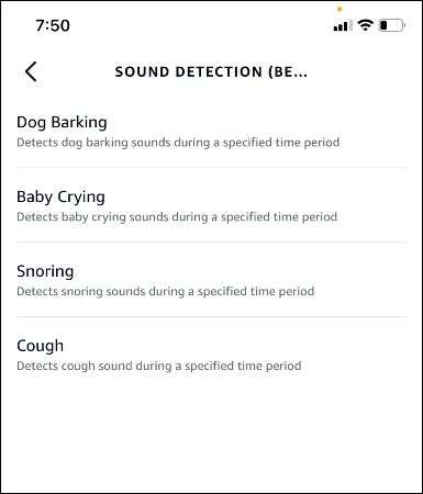 Nella pagina di rilevamento, hai la possibilità di scegliere un cane che abbaia, un bambino che piange, russando e tosse.