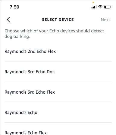 Nella schermata seguente, scegliere quale dispositivo abilitato Alexa collegato che desideri rilevare il suono. Toccare il dispositivo, seguito da "Avanti" nell'angolo in alto a destra.