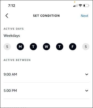 Per cambiare il programma, toccare "I giorni feriali". Avrai la possibilità di selezionare i giorni attivi della funzione di rilevamento del suono (domenica attraverso il sabato). Inoltre, è possibile impostare un daypart (ad esempio Active tra le 9:00 alle 5:00 P.M.), seguito da un periodo di soppressione, che è il numero di minuti e / o ore che Alexa attenderà prima di eseguire nuovamente la routine.