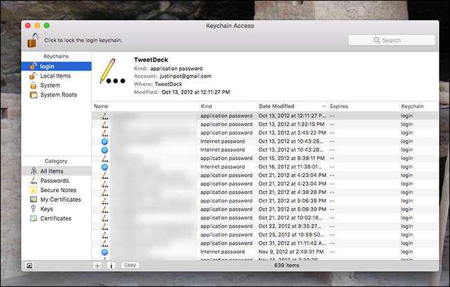 Di seguito troverai categorie di cose che Accesso Portachiavi può memorizzare. Fondamentalmente agiscono come un filtro: fai clic su "Password", ad esempio, e vedrai solo le password memorizzate nel portachiavi che stai guardando in questo momento.