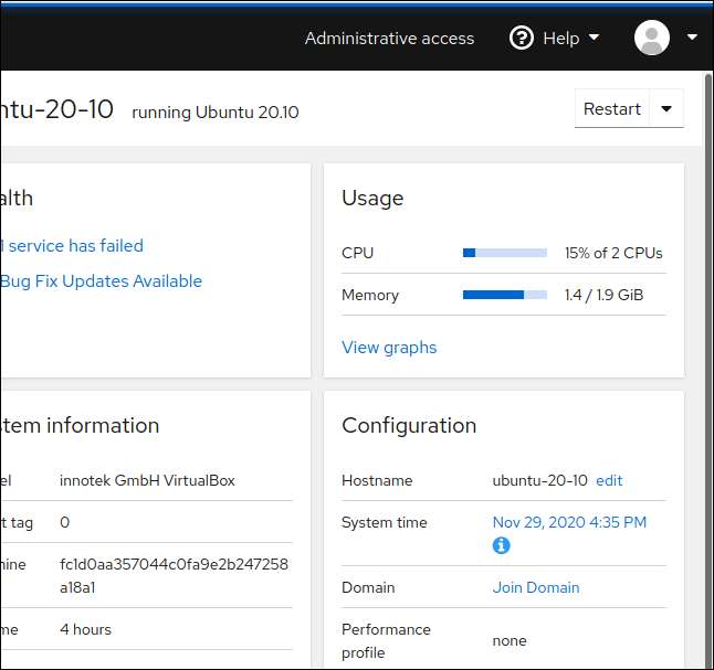 - Installa il cockpit sull'altro computer, quindi accedi al cockpit per verificare che funzioni. Non è necessario avere l'interfaccia del browser in esecuzione sulla macchina remota quando lo stai monitorando in remoto. Tuttavia, se lo fai, dimostrerà il cockpit è stato installato correttamente ed è pienamente operativo.