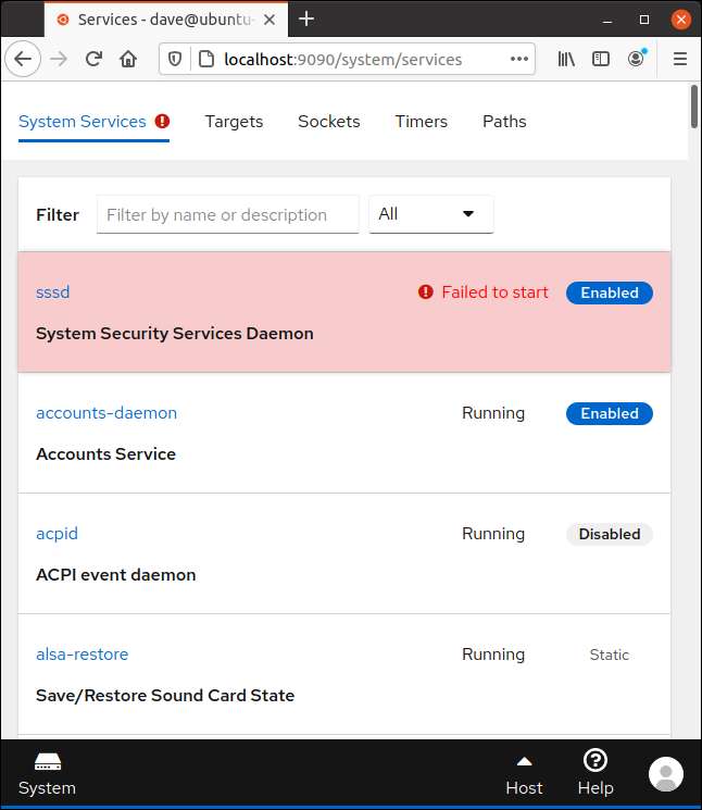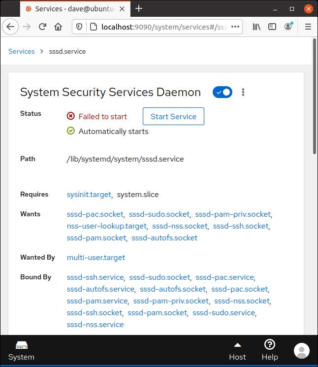 Fare clic sul collegamento "1 servizio non riuscito" per passare alla visualizzazione dei servizi di sistema. Il Daemon dei servizi di sicurezza del sistema (SSSD) non è riuscito ad avviare, quindi faremo clic sul collegamento "SSSD" per passare alla pagina di controllo SSSD.