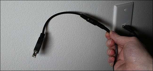 Questo ricollegherà quel cavo Ethernet alla tua rete, ma ora avrai un connettore separato che si separa: collegherai il tuo dispositivo a quello. Se non c'era già un cavo collegato a quella derivazione Ethernet, puoi ignorare il connettore Ethernet femmina sull'adattatore. Ma se in futuro vorrai collegare un cavo Ethernet, puoi farlo utilizzando il connettore femmina sull'adattatore.