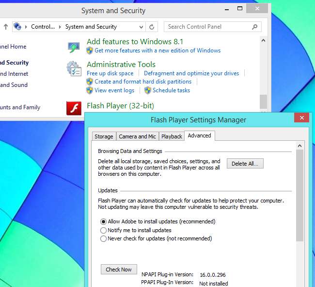 Su Windows, troverai questa opzione in Flash Player nel pannello di controllo. Apri il pannello di controllo e cerca "Flash" per trovare il collegamento, oppure fai clic sulla categoria Sistema e sicurezza e scorri fino in fondo. Fare clic sull'icona "Flash Player", fare clic sulla scheda Avanzate e assicurarsi che gli aggiornamenti automatici siano abilitati.