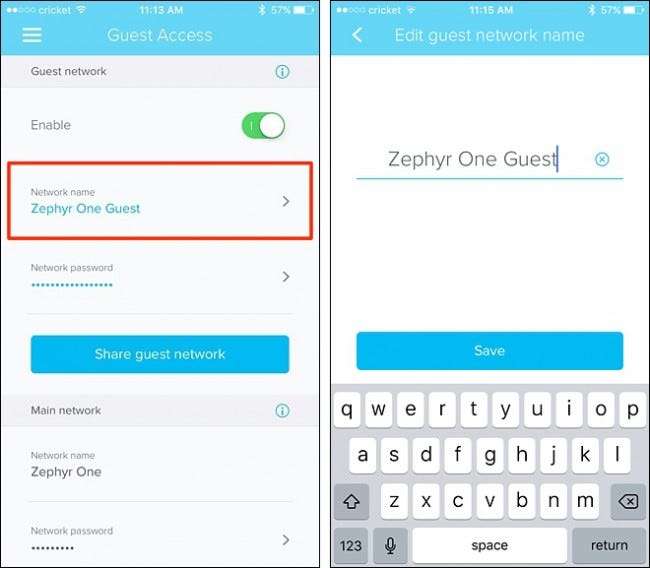 Quindi, tocca "Nome rete" e assegna alla rete Wi-Fi ospite un nome personalizzato, se lo desideri. Per impostazione predefinita, aggiungerà semplicemente "Ospite" alla fine del nome della rete corrente.
