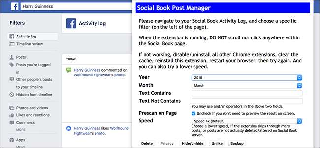 Imposta Social Book Post Manager nel modo desiderato, quindi fai clic sul pulsante "Elimina". Social Book Post Manager verrà eseguito, scorrendo la pagina verso il basso. Siediti e lascia che faccia il suo dovere. Più post scegli come target, più tempo ci vorrà.