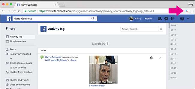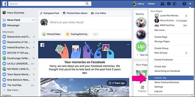 Ora l'estensione è pronta, vai su Facebook. Se vuoi, puoi scarica una copia di tutti i dati che hai mai pubblicato su Facebook come backup. Dopodiché (o al posto di quello se non ti interessa eseguire il backup dei tuoi vecchi post), fai clic sulla freccia rivolta verso il basso in alto a destra e seleziona il comando "Registro attività".