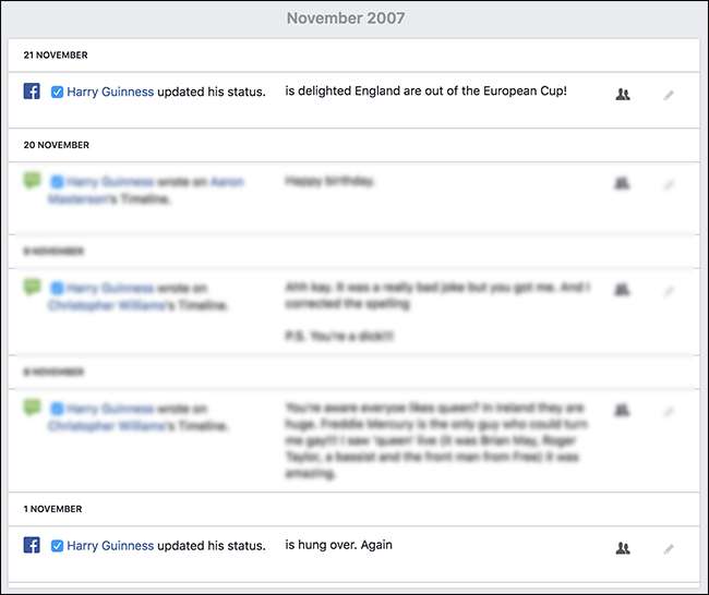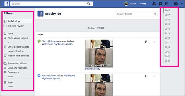 Viene visualizzato il registro delle attività tutto ciò che hai mai fatto su Facebook . È piuttosto terrificante scorrere indietro. Puoi visualizzare tipi specifici di attività utilizzando i filtri sul lato sinistro e passare a una determinata data utilizzando la navigazione sul lato destro.