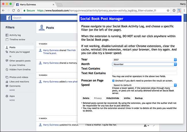 Per dimostrare come funziona, sceglierò come target tutti i miei post da novembre 2007. Innanzitutto, ho selezionato il filtro "Post" in Facebook in modo che l'estensione targetizzerà solo i miei post. Quindi, ho aperto l'estensione Social Book Post Manager, selezionato 2007 per l'anno e novembre per il mese. Ho lasciato l'opzione "Prescansione sulla pagina" abilitata in modo da poter rivedere i post prima che vengano eliminati. E non sto utilizzando nessuna parola chiave.