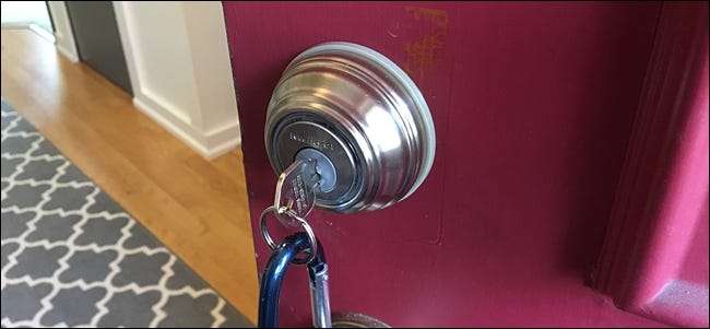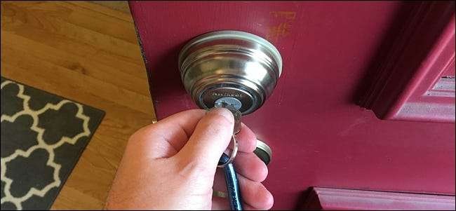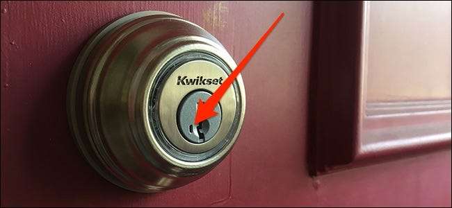 Per questa guida, utilizzeremo una serratura intelligente Kwikset Kevo, ma molte nuove serrature Kwikset sono dotate della stessa tecnologia SmartKey. Se non sei sicuro della tua serratura, osservala da vicino e verifica se c'è un piccolo foro ovale accanto al buco della serratura. In tal caso, si tratta di una serratura SmartKey.