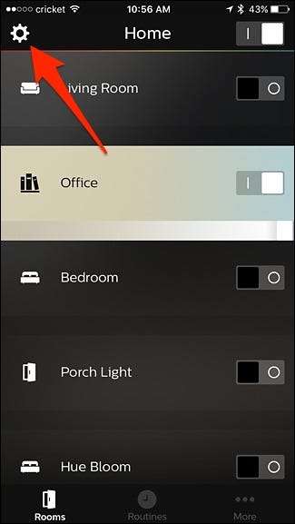 Il tuo interruttore dimmer Hue può essere configurato e personalizzato dall'app Hue stessa toccando prima l'icona dell'ingranaggio delle impostazioni nell'angolo in alto a sinistra dello schermo.