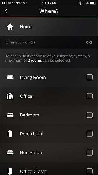Seleziona la stanza che desideri venga controllata dal tuo interruttore dimmer tonalità. È possibile selezionare fino a due stanze da controllare contemporaneamente. Dopo la selezione, premi il pulsante Indietro nell'angolo in alto a sinistra per tornare indietro.