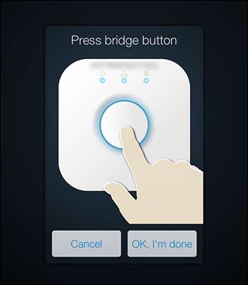 Avvia l'app iConnectHue e inizierà immediatamente a cercare nella tua rete domestica il tuo Hue Bridge. Quando richiesto, premi il pulsante fisico al centro dell'hub, quindi seleziona "OK, ho finito" quando lo hai fatto.
