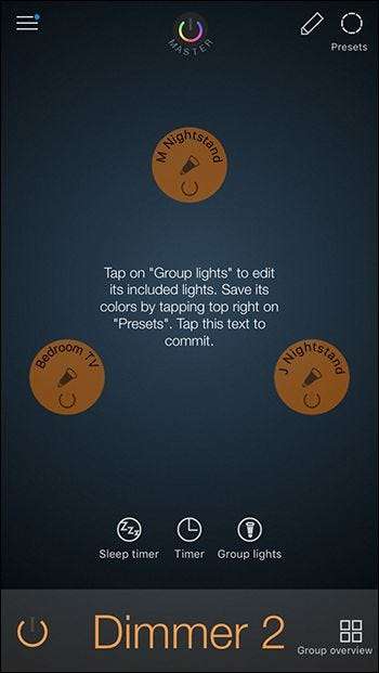 Sebbene siano raggruppati correttamente con l'interruttore Dimmer, "Dimmer 2" non è un nome di gruppo estremamente intuitivo, quindi lo cambieremo immediatamente. Puoi rinominare qualsiasi gruppo premendo e tenendo premuto il suo nome.