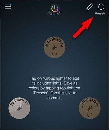 Nell'app iConnectHue, tocca il piccolo cerchio denominato "Preset" nell'angolo in alto a destra. Si noti che gli indicatori luminosi sul pannello di controllo, visti di seguito, riflettono la configurazione della luce appena descritta (le lampade del comodino sono spente e la luce di polarizzazione della TV è accesa).