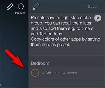Nel menu Preset, tocca "Aggiungi come nuovo preset" sotto il gruppo a cui desideri aggiungere il preset.