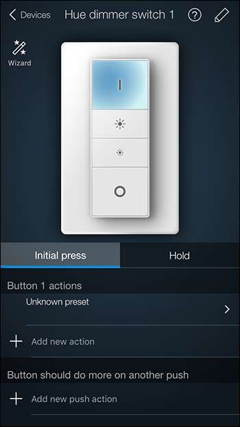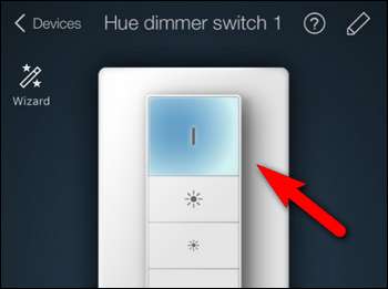 Vedrai quindi un layout del tuo interruttore dimmer tonalità e potrai toccare ciascuno dei quattro pulsanti dell'interruttore per vedere cosa fa. Sfortunatamente, solo il pulsante "On" è personalizzabile.