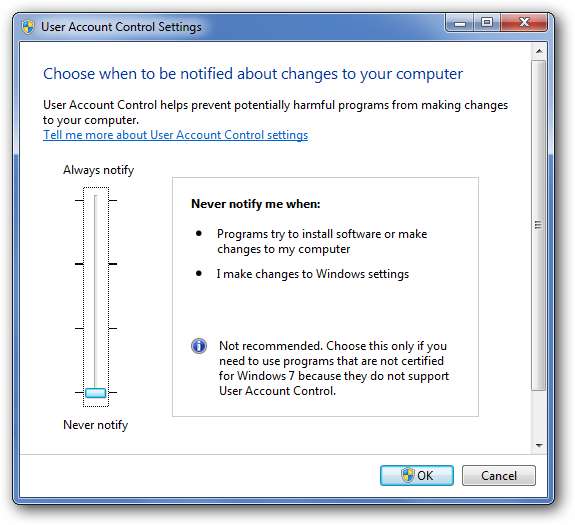 Sfortunatamente, non c'è modo di disabilitare completamente l'UAC dall'interfaccia utente: certo, puoi trascinare il cursore fino in fondo per assicurarti di non vedere mai una notifica, ma l'UAC è ancora in esecuzione dietro le quinte, quindi devi continuare a " Esegui come amministratore "per qualsiasi strumento di sistema che utilizzi.