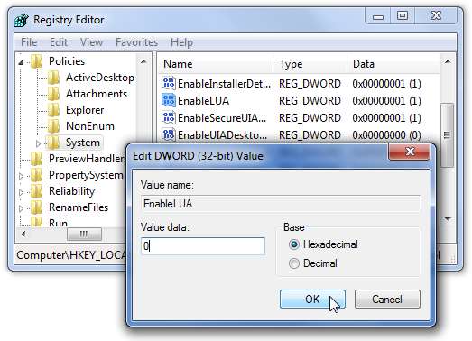 Poiché l'unico modo per disabilitare completamente l'UAC in tutte le versioni di Windows 7 è un hack del registro