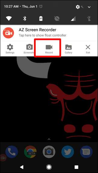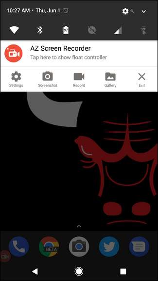 Vai avanti e installalo dal Play Store , quindi accendilo. ci vorrà un secondo per preparare tutto, quindi verrà visualizzata una piccola finestra popup con una manciata di pulsanti: Impostazioni, Screenshot, Registra, Immagini e Mercato. Gli unici di cui devi veramente preoccuparti sono Impostazioni e Registra. C'è anche una voce nella barra delle notifiche che puoi utilizzare per accedere alle funzioni di AZ.