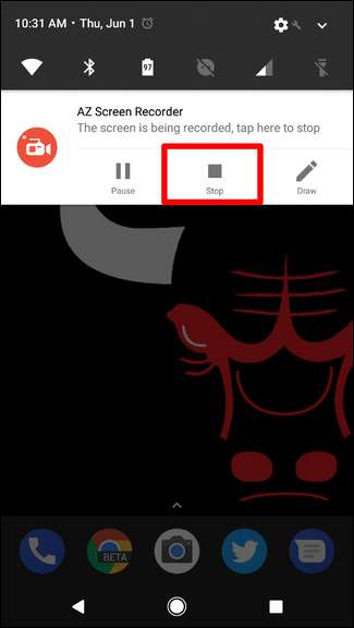 Quando hai finito con la registrazione, basta abbassare la tendina e toccare il pulsante "Stop". Il video verrà salvato e verrà visualizzata una piccola finestra che ti consentirà di modificare il video, se lo desideri. Altrimenti salverà solo sul tuo dispositivo.