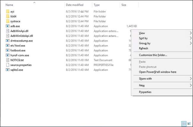 Innanzitutto, avvia la riga di comando per qualunque sistema operativo stai utilizzando. Se stai utilizzando Windows e non ti sei preoccupato di aggiungere adb al tuo PATH di sistema, dovrai accedere alla cartella di installazione dell'SDK, trovare adb negli strumenti della piattaforma e MAIUSC + clic destro, quindi scegliere "Apri PowerShell Window Here "(potrebbe anche leggere" Open Command Prompt Here "a seconda della versione di Windows) per far funzionare correttamente adb.