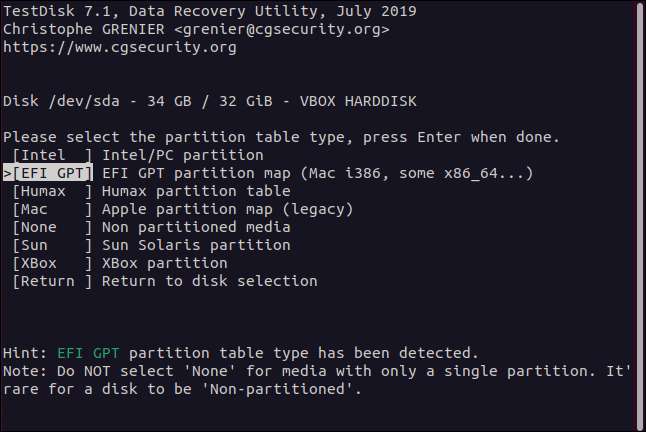 Deve anche conoscere il tipo di partizione. Presenta un menu di opzioni, insieme al tipo di partizione è autodetevato nella parte inferiore.