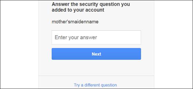 Se non funziona, ad esempio, ad esempio, non hai accesso all'account che hai originariamente designato come backup, fai di nuovo clic su "prova una domanda diversa". Ora stiamo entrando in metodi più vecchi e meno sicuri di protezione dell'account, come domande di sicurezza come "qual è il nome da nubile di tua madre". Dovresti essere in grado di rispondere almeno a una di queste.