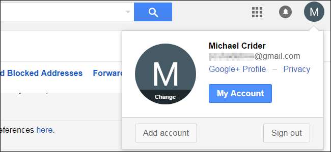 Una volta che sei nel tuo account Gmail corretto, vai alla pagina Impostazioni account Google facendo clic sulla tua immagine del profilo (è solo la prima lettera del tuo nome se non ne hai impostato uno) nell'angolo in alto a destra, quindi "Il mio Account."