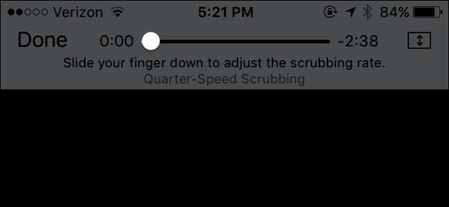 Se desideri modificare la velocità di scorrimento, fai scorrere il dito verso il basso tenendo premuto il punto. Il display cambierà per mostrare la velocità di scrub. Le opzioni includono Hi-Speed (impostazione predefinita), Half-Speed, Quarter-Speed e Fine. Puoi anche far scorrere il dito verso l'alto tra le opzioni. Tenendo ancora premuto il punto, puoi spostarti a sinistra ea destra per eseguire lo scorrimento alla velocità selezionata.
