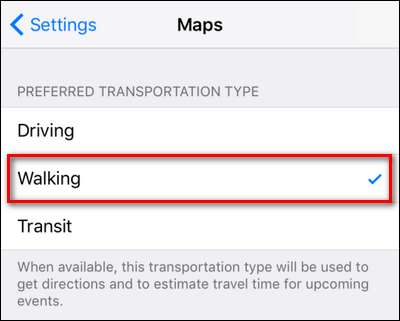 All'interno delle impostazioni di Maps, passa dalla modalità predefinita nella sezione "Tipo di trasporto preferito" a "A piedi.