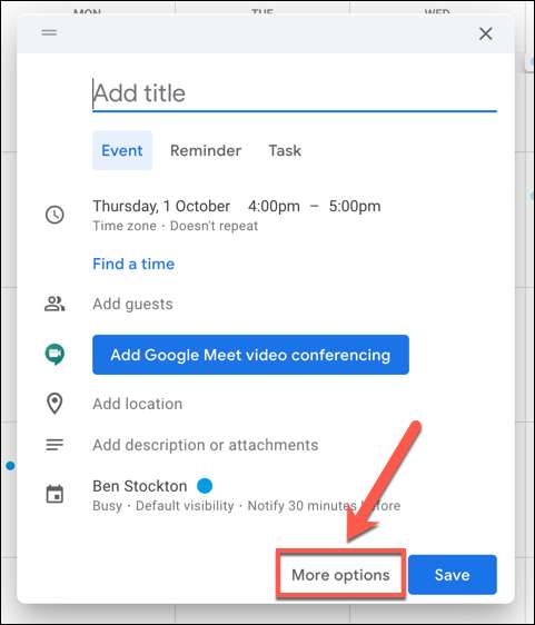 Se stai creando un evento, fai clic sul pulsante "Altre opzioni" nella parte inferiore del nuovo menu a comparsa Evento.