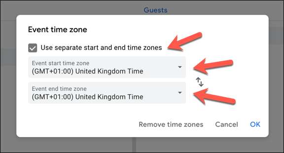 Se si desidera un fuso orario diverso per l'ora di fine dell'evento, fare clic per abilitare la casella di controllo "Usa separare le zone di avvio e ora di fine" e quindi selezionare un fuso orario diverso dal menu a discesa "Event End Time Full".