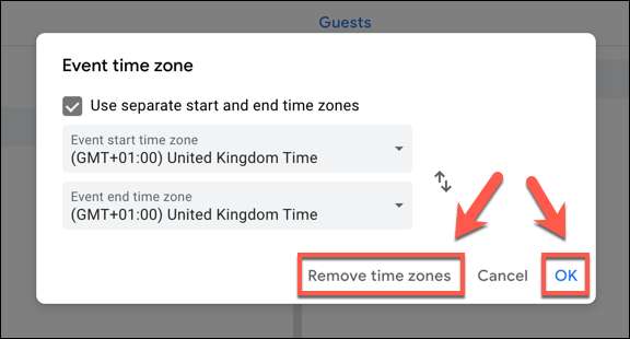 Se si desidera rimuovere le zone di tempo personalizzate in qualsiasi punto e tornare a utilizzare il fuso orario predefinito allegato al tuo account Google, fare clic sul pulsante "Rimuovi fusi orari".