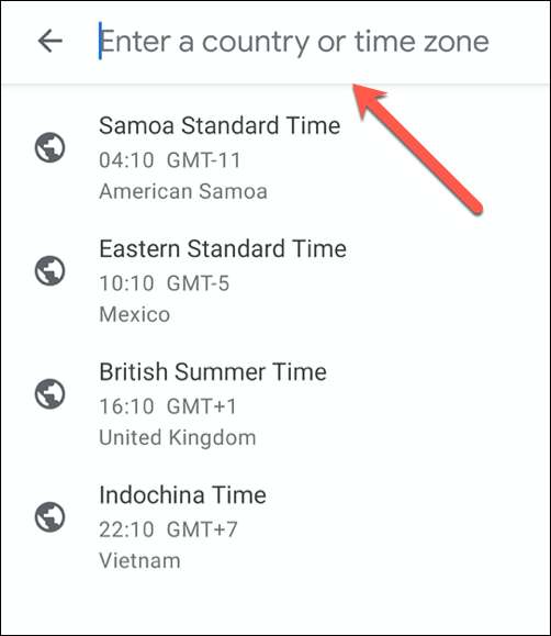 Cerca un paese o un fuso orario specifico nel menu successivo, quindi toccare uno dei risultati per selezionarlo come nuovo fuso orario.